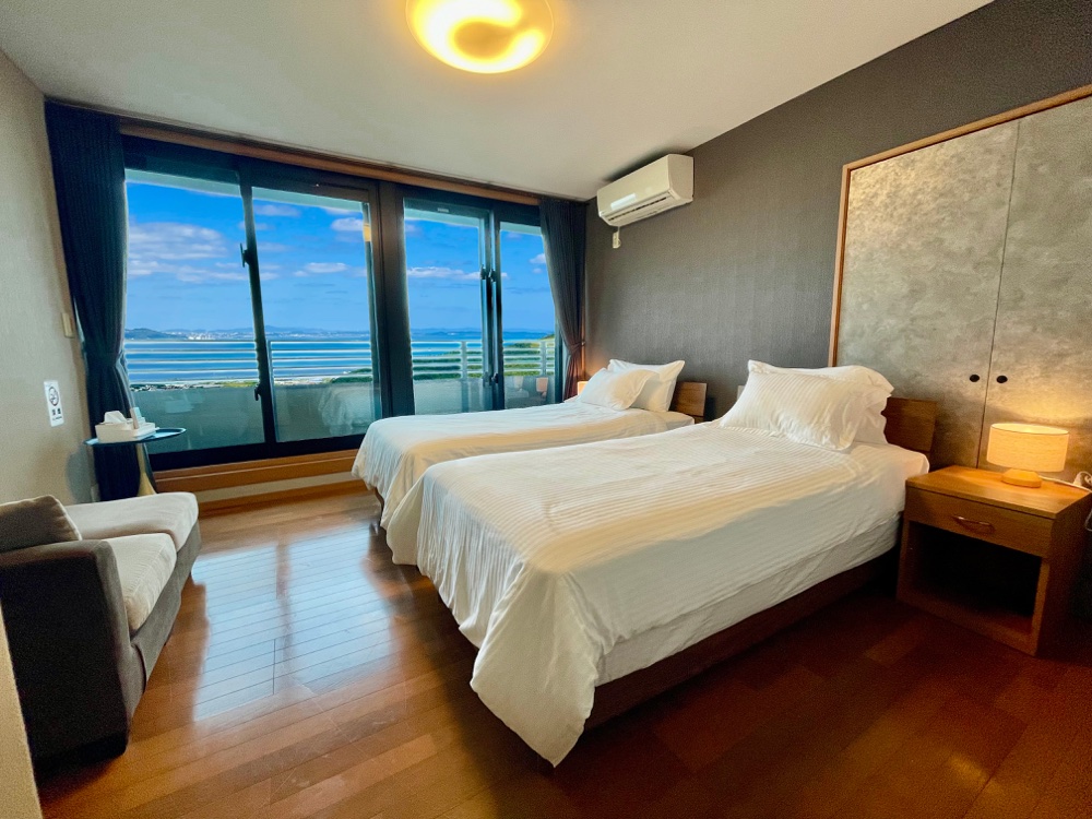 太平洋を望むパノラマビュー。ダブルベッド完備。